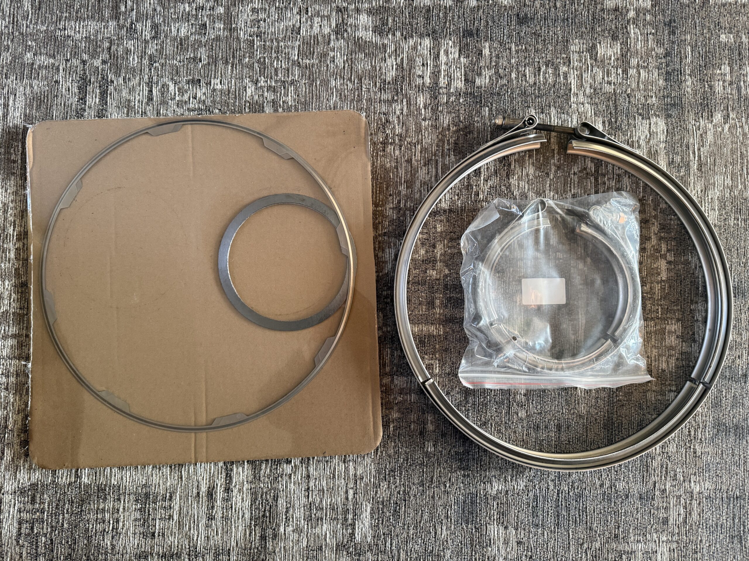 Deze pakkingset bestaat uit 5 delen, 2x klemband, 2x metalen pakking 1x grafietpakking